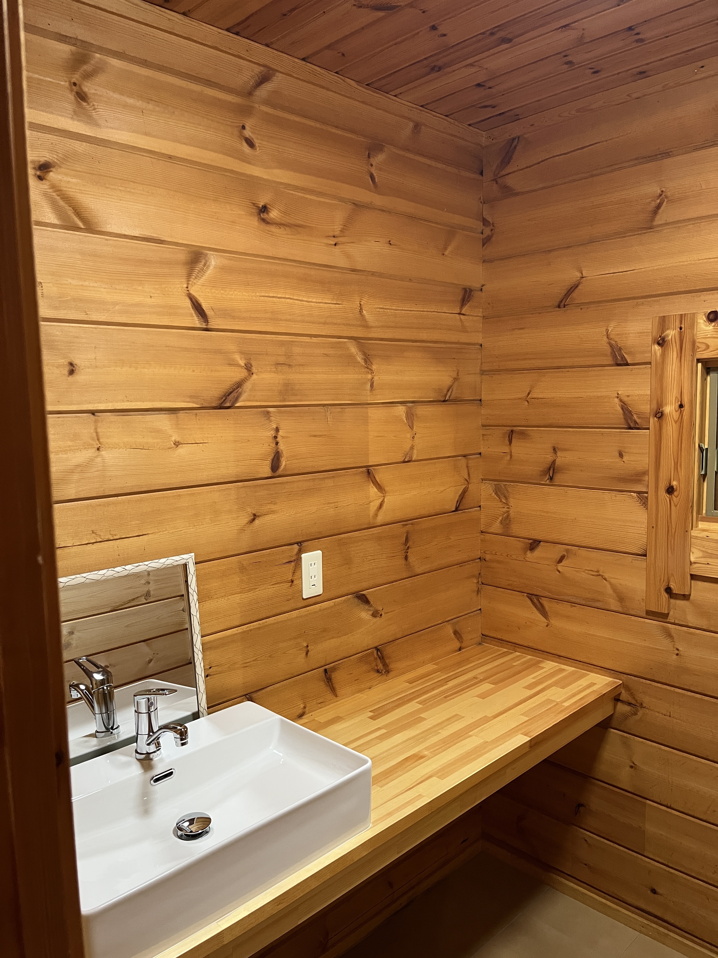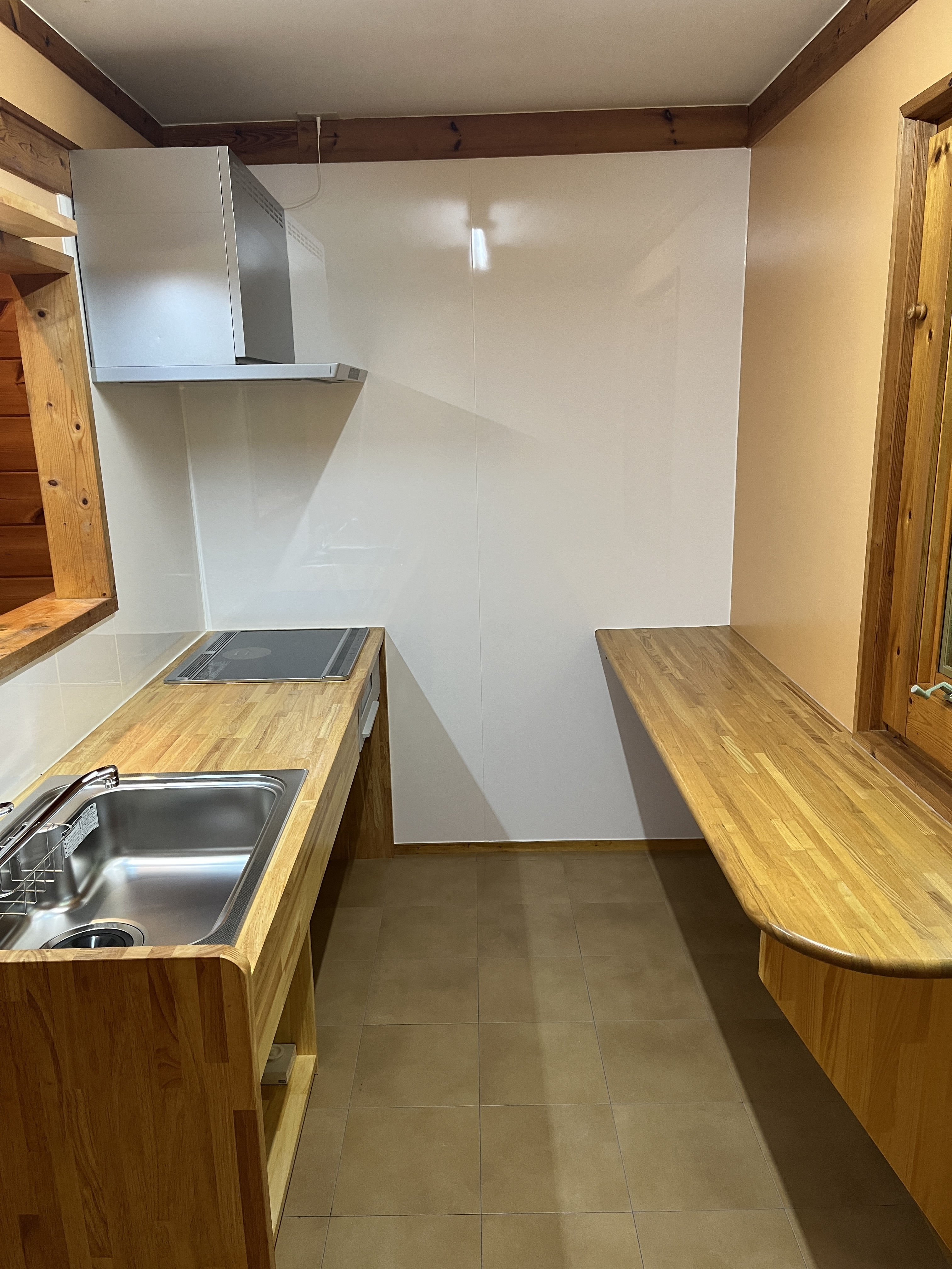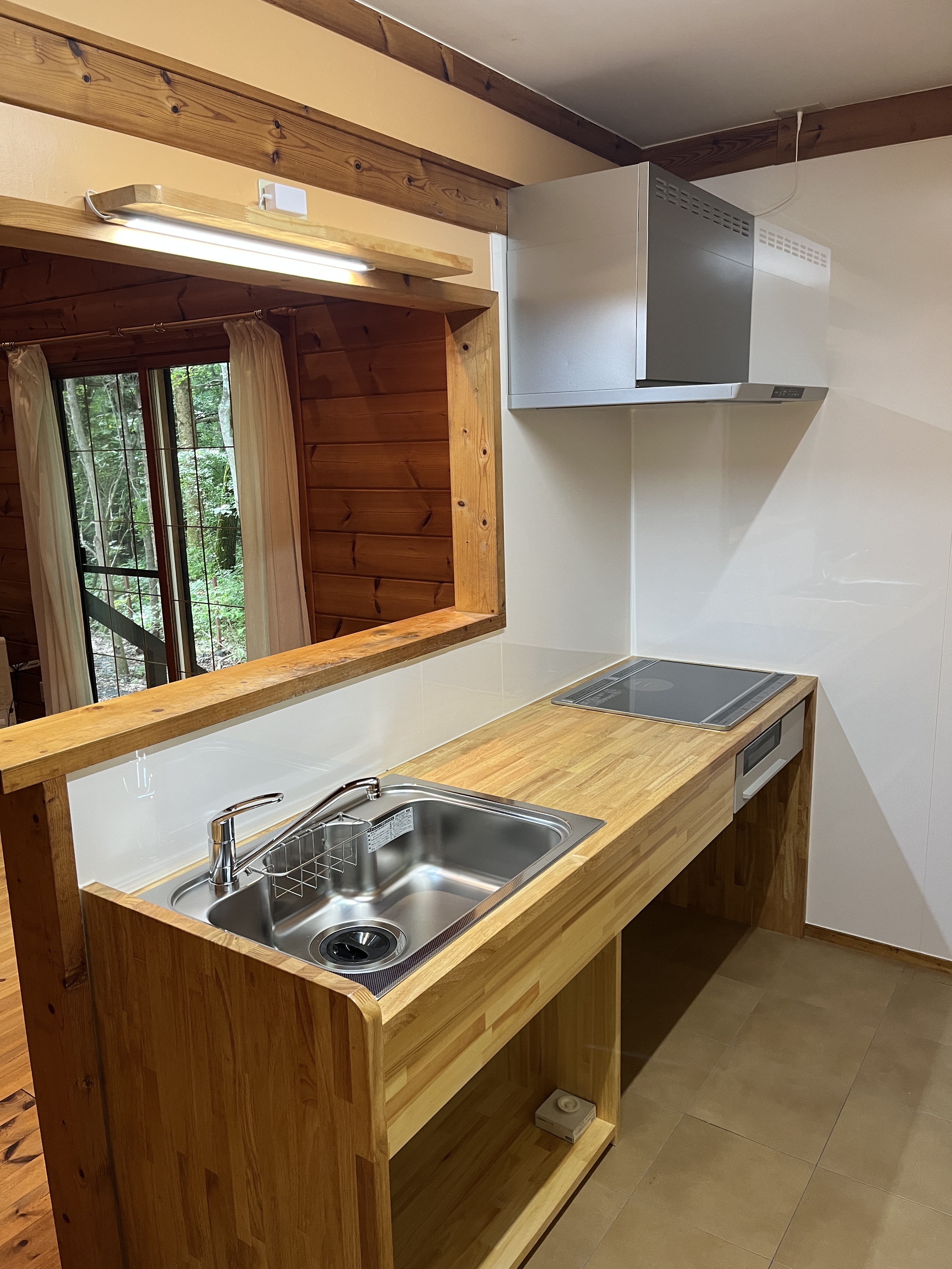 ログハウスにマッチするよう、造り替えられたキッチン