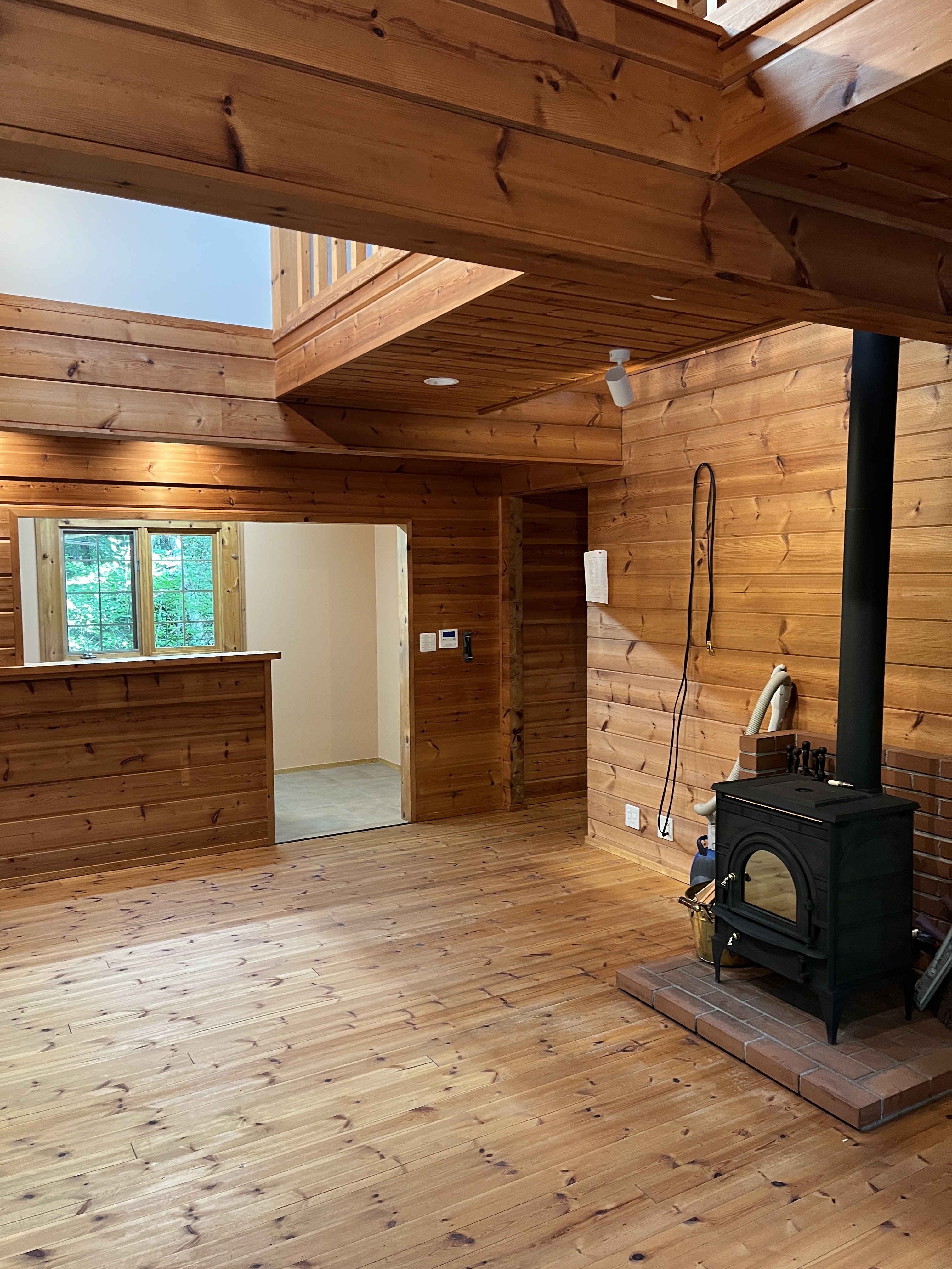 1Fは薪ストーブとFF石油暖房機を備えたリビングと7,5帖の洋室。2Fは6帖の洋室と20帖のフリースペース。